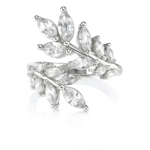 טבעת פתוחה מכסף 925 משובת זירקונים בצורת מרקיז המדמים עלים עדינים שמטפסים סביב האצבע.