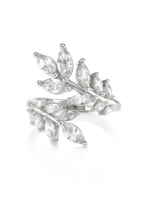 טבעת כסף 925 פתוחה עם שיבוץ עלים בצורת מרקיזות.