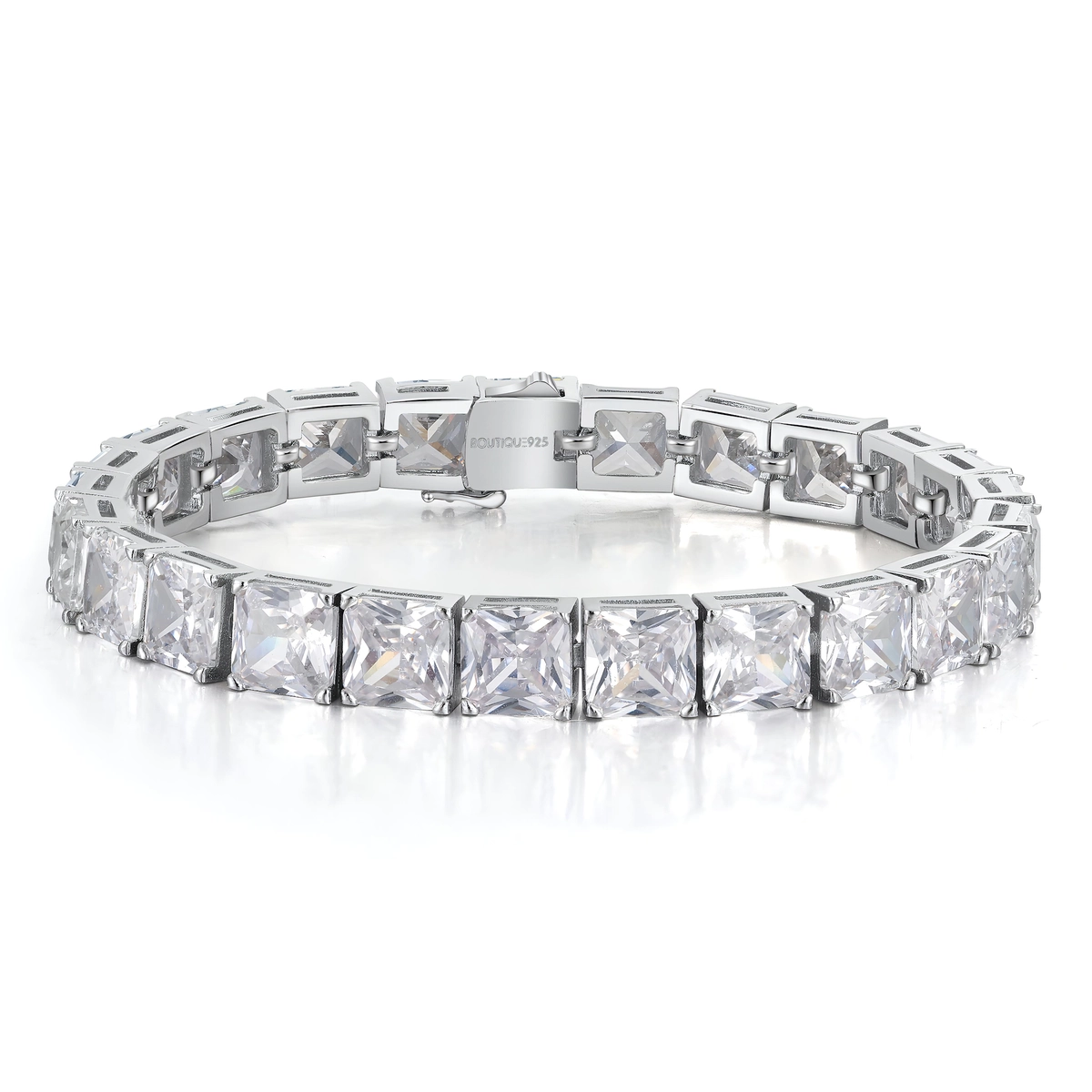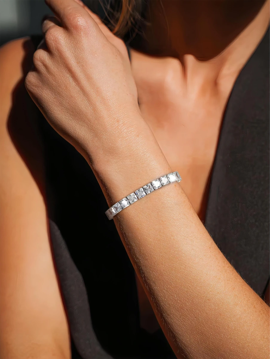הצמיד כולל מערך רציף של זירקונים מרובעים מנצנצים. הצמיד משובץ באבני זירקון בחיתוך Princess Cut – חיתוך מרובע עוצמתי שמעניק לכל אבן ברק אלגנטי ומדויק. מדובר באחד החיתוכים המבוקשים ביותר בעולם היהלומים, בזכות הניצוץ המרשים והמראה היוקרתי שהוא יוצר.