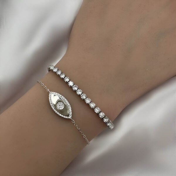 צמיד טניס שיבוץ עגול עם סוגר חוט שמאפשר לך להתאים את הצמיד במדוייק לידך, עובי זירקון 0.3 מכסף 925 טהור לאישה. הצמיד משובץ בזירקוני AAAA בחיתוך יהלום. המוצר מגיע באריזת מתנה ממותגת ומהודרת! חצי שנה אחריות.
