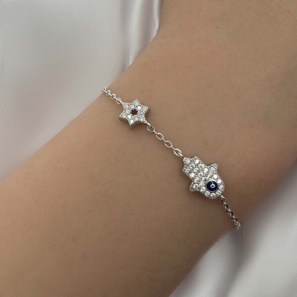 צמיד חמסה ומגן דוד משובץ בזירקונים מכסף 925 טהור לאישה. הצמיד משובץ בזירקוני AAAA בחיתוך יהלום. מצופה ברודיום להגנה מפני התחמצנות ושריטות. המוצר מגיע באריזת מתנה ממותגת ומהודרת! חצי שנה אחריות.