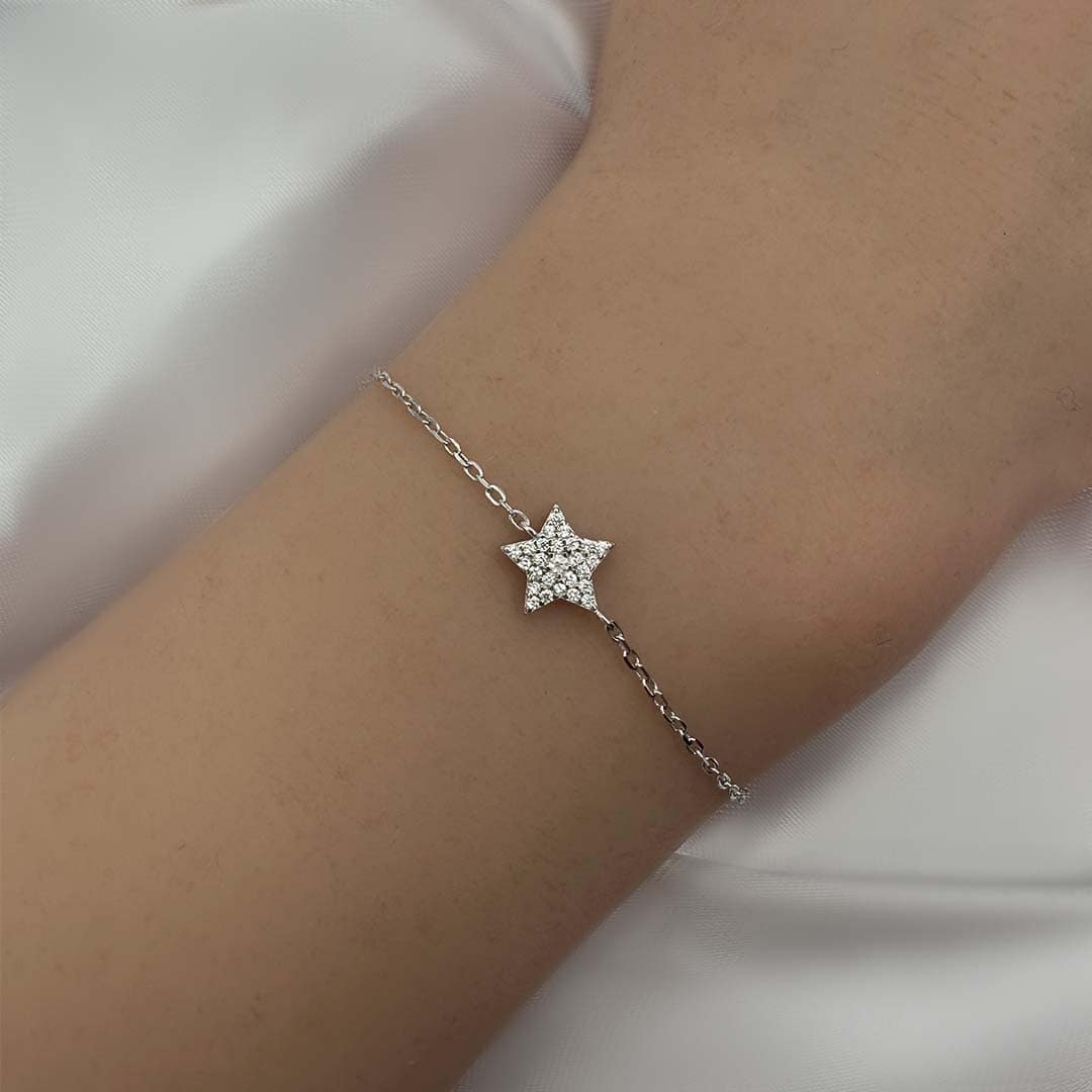 צמיד כסף כוכב קטן בזירקונים מכסף 925 טהור לאישה. הצמיד משובץ בזירקוני AAAA בחיתוך יהלום. מצופה ברודיום להגנה מפני התחמצנות ושריטות. המוצר מגיע באריזת מתנה ממותגת ומהודרת! חצי שנה אחריות.