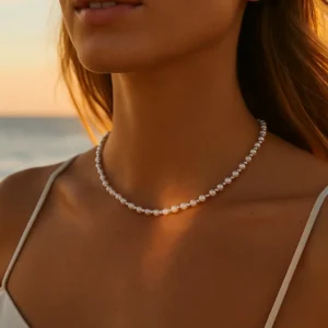 השרשרת מורכבת משילוב של חרוזים עגולים כסופים בקוטר 3 מ"מ וחרוזים לבנים בקוטר 4 מ"מ.