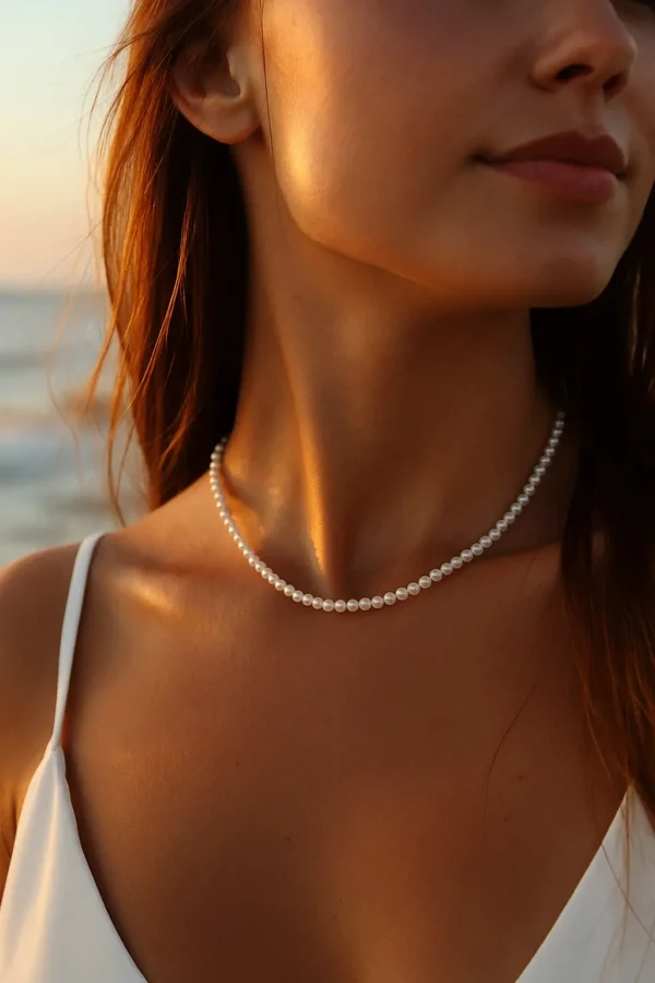 השרשרת מורכבת משילוב של חרוזים עגולים כסופים בקוטר 3 מ"מ וחרוזים לבנים בקוטר 4 מ"מ.