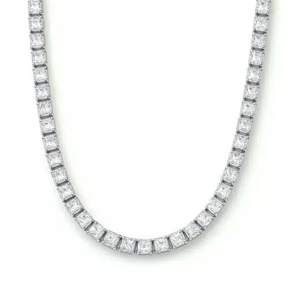 השרשרת משובצת באבני זירקון בחיתוך Princess Cut – חיתוך מרובע עוצמתי שמעניק לכל אבן ברק אלגנטי ומדויק. מדובר באחד החיתוכים המבוקשים ביותר בעולם היהלומים, בזכות הניצוץ המרשים והמראה היוקרתי שהוא יוצר.