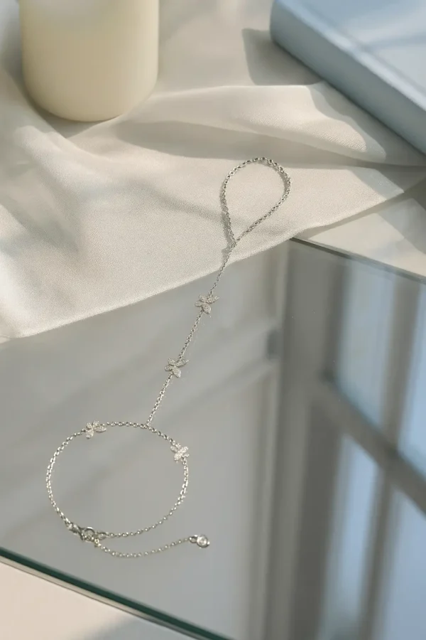 צמיד טבעת בעיצוב פרפרים משובצים זירקונים – מתחיל מהצמיד, עובר לאורך כף היד ומתחבר כטבעת על האצבע. תכשיט עדין ומיוחד שמוסיף סטייל לכל לוק.
