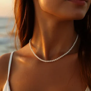 השרשרת מורכבת משילוב של חרוזים עגולים כסופים בקוטר 3 מ"מ וחרוזים לבנים בקוטר 4 מ"מ.