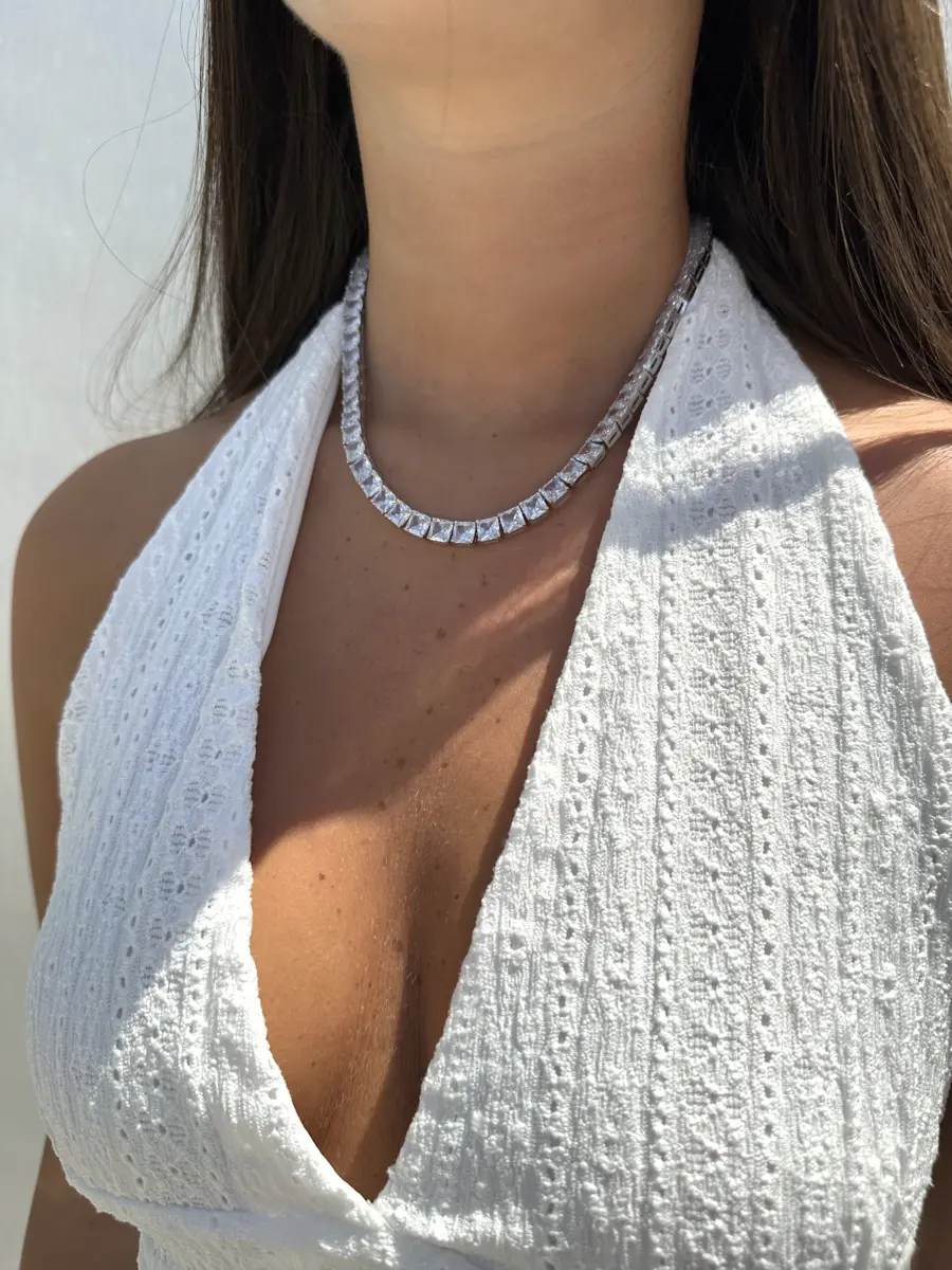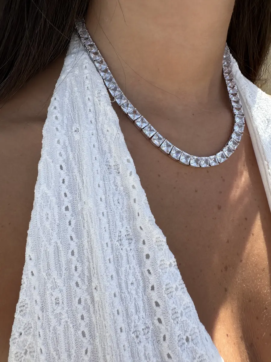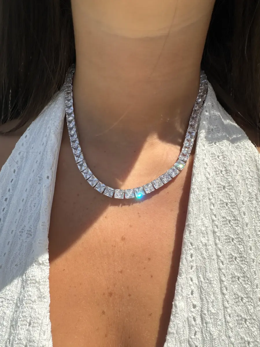 השרשרת כוללת כולל מערך רציף של זירקונים מרובעות מנצנצות, שנבחרו בקפידה ושובצו על ידי מומחה כדי להבטיח שכל זירקון נוצץ בצורה המקסימלית, השרשרת משובצת בחיתוך יהלום Princess Cut – חיתוך עוצמתי שמפזר אור באלגנטיות