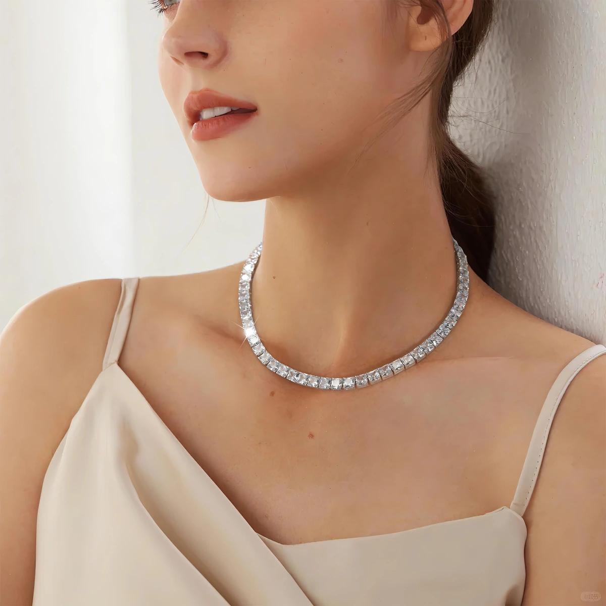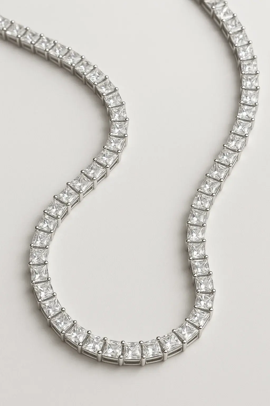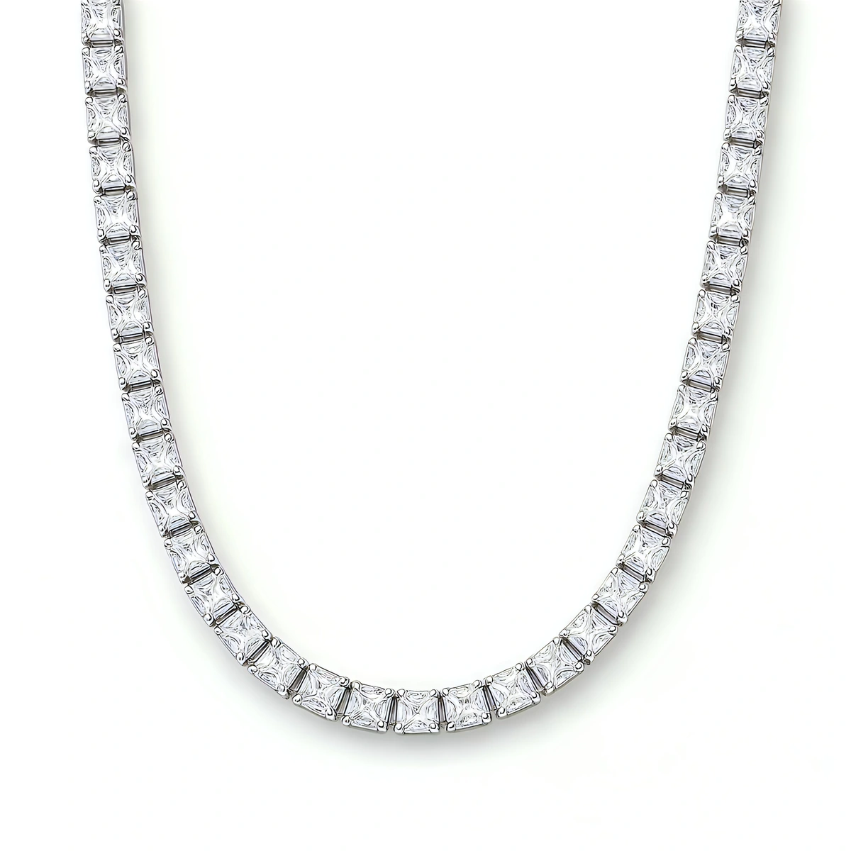 השרשרת כוללת כולל מערך רציף של זירקונים מרובעות מנצנצות, שנבחרו בקפידה ושובצו על ידי מומחה כדי להבטיח שכל זירקון נוצץ בצורה המקסימלית, השרשרת משובצת בחיתוך יהלום Princess Cut – חיתוך עוצמתי שמפזר אור באלגנטיות