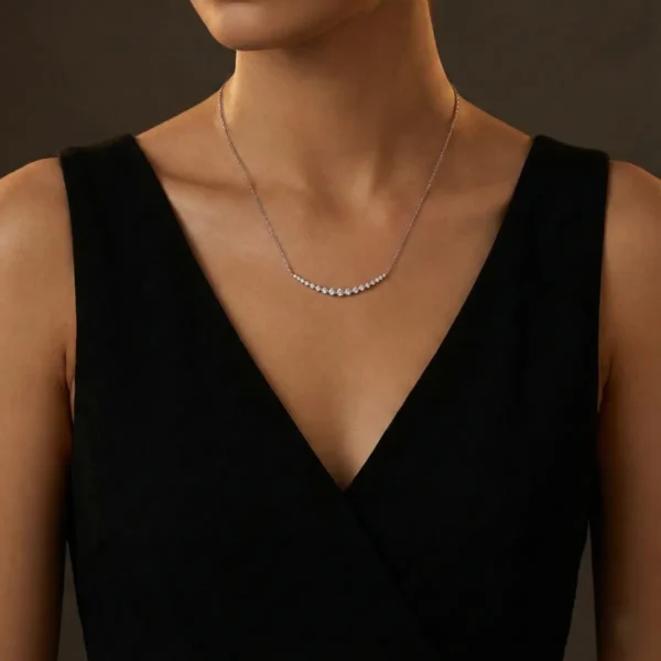 שרשרת טניס מואסנייט עדינה עם 16 אבנים מדורגות. השרשרת עשויה כסף 925 בציפוי זהב לבן כולל שכבת רודיום להגנה. שרשרת שיוצרת ברק אחיד וזורם על הצוואר – לא מוגזם, לא מתאמץ.