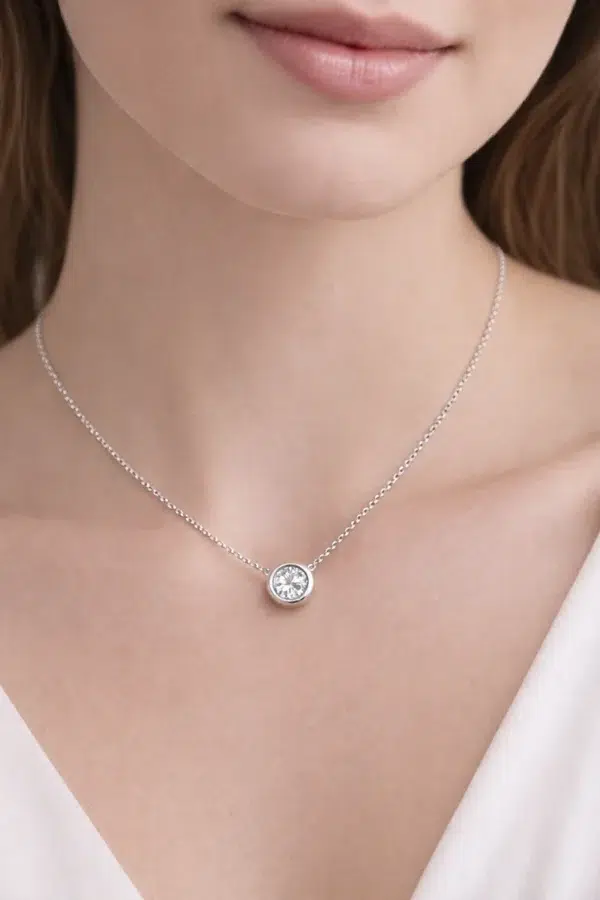 שרשרת סוליטר מואסנייט בעיצוב מודרני ונקי. התליון כולל אבן איכותית בדרגת D Color VVS1 המשובצת במסגרת בזל חלקה שמעניקה מראה מרחף ומדויק על הצוואר.